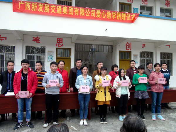 當日,集團公司在豹山村舉行愛心助學捐贈儀式,掛牌成立了廣西新發(fā)展交通集團愛心助學基金會,向扶貧聯(lián)系點200多名貧困學子捐資助學獻愛心。劉明洪副總經(jīng)理殷切希望貧困學子們努力學習,常懷感恩之心,學好本領,將來回報家鄉(xiāng)、回報社會。