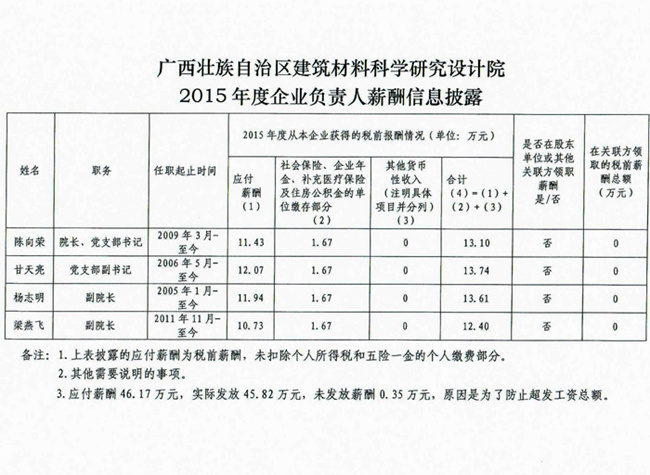 廣西壯族自治區(qū)建筑材料科學研究設計院2015年度企業(yè)負責人薪酬信息披露